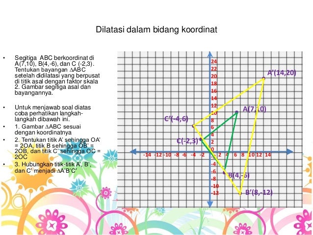 Bayangan Kurya Y X 1 Oleh Dilatasi Pusat O Dengan Faktor Skala 2 Dilanjutkan Pencerminan Brainly Co Id from id-static.z-dn.net Segitiga abc didalatasi dengan pusat dilatasi titik awal p (0, 0) sehingga menghasilkan segitiga a 2 b 2 c 2 dan segitiga a 3 b 3 c 3. Dilatasi yang berpusat di p dengan faktor skala k dinotasikan dengan p,k. Dilatasi pada transformasi geometri mengakibatkan ukuran benda berubah, faktor yang menyebabkan diperbesar atau diperkecilnya suatu bangun ini disebut faktor dilatasi atau faktor skala atau faktor pengali. Hasil bayangan yang dibentuk dari dilatasi hanya ada dua jenis: Tentukan lah bayangan segitiga abc atau a'b'c'. Soal dan pembahasan dilatasi perkalian dengan matriks ilmuku duniaku. Ingat, rumus dilatasi terhadap titik pusat dengan faktor skala adalah. Pengertian dilatasi dilatasi atau perkalian bangun adalah suatu transformasi yang memetakan himpunan titik (bangun) ke himpunan titik lainnya dengan cara memperbesar atau memperkecil dengan titik pusat dilatasi tertentu.